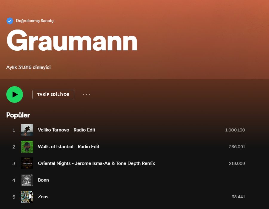18 Aralık 2020 tarihinde NOTOFC etiketiyle çıkış yapan, Melodic House & Techno türündeki Graumann ‘ın “Veliko Tarnovo” şarkısı, Spotify’da editöryal listeler olan Harekete Geç ve Hit Dans gibi müzik listelerinde de uzun zaman yer alarak 1 milyon dinlenmeye ulaştı.